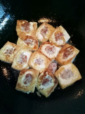 全部酿好后,烧热油锅,把一块块酿好的豆腐放入锅内