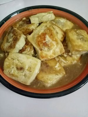 豆腐切方形大块,少许油煎至两边金黄。放一大块腐乳和一滴酱油,在倒入少许开水,大火烧一分钟就OK了。