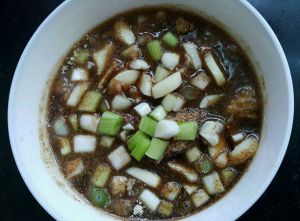 准备好酱汁(十三香.蚝油.生抽.白糖.鸡粉.胡椒粉.南乳.姜.大蒜.葱白)看分量调