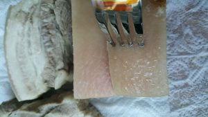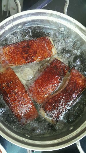 用平底锅小火煎, 煎至猪皮起小泡 出锅 放冰水泡软猪皮