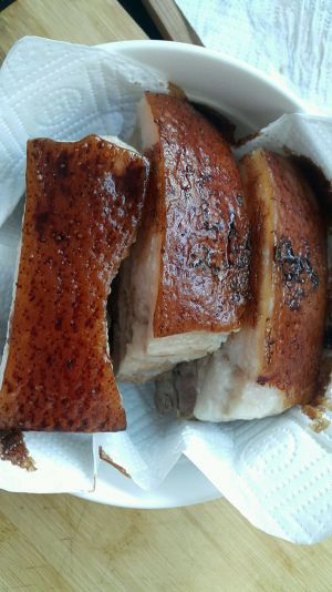 大火把油烧烧到六成热,油温不能太高,以免热油贱出来。放入五花肉马上盖上锅盖,不一会儿,就听到油脂在锅里炸开的声音,这时候可以把火调小,不然就很容易把皮炸糊了。轻轻调整锅的位置,让肉皮均匀受热