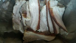 炸好的五花肉放入煮肉的汤锅里,一是为了降温,也可以把炸硬的猪皮泡软,等会儿容易切片