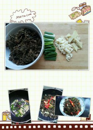梅菜干泡水 洗干净 切好(葱,姜,蒜)辣椒可不加 小火在锅里慢慢炒半干