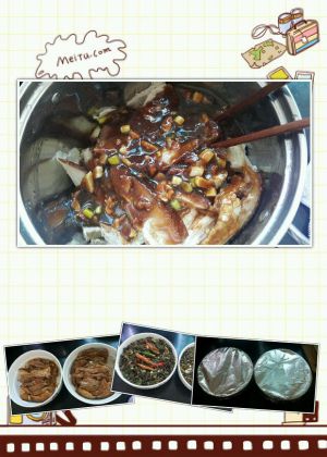 调料混合一起,放五花肉搅拌均匀,(皮朝下装碗) 把梅菜放入剩下的汁拌匀 放在扣肉上,(封上锡纸蒸2小时可以保证原汁原味 不包蒸完味道全淡了) 越久越入味