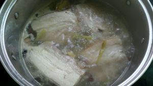 买一块方形的猪肉回来,凉水下锅焯水,同时加入几大片生姜、葱、白酒除腥味。时间大概二十分钟即可。