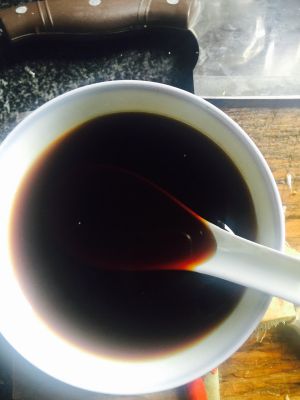 一勺料酒,两勺生抽,三勺白糖,四勺白醋兑成糖醋汁。汤勺就用家里常用的这种瓷汤勺