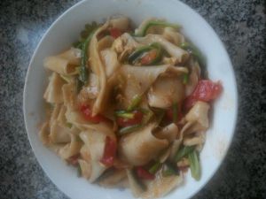 锅里再放油,油热后倒入晾干的面快速翻炒,待面条颜色有点焦黄时倒入鸡蛋、洋葱、火腿一起翻炒,然后下酱油调味,喜欢吃辣的可以放些辣椒酱一起炒