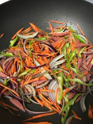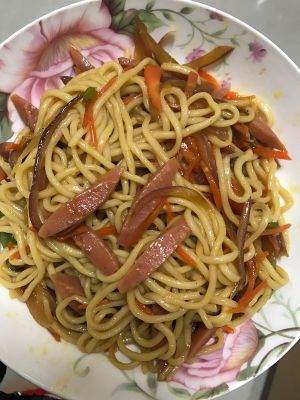 锅内放油,十三香,炒下配菜,再放入面条,调入酱油,盐,耗油,添少许汤,翻炒均匀即可出锅