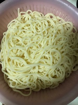 外面买的面条煮至八分熟,别煮全熟,因为一会还得炒