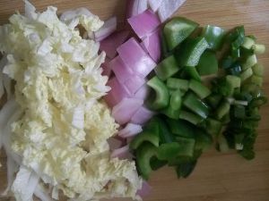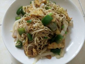 先炒洋葱丝,火腿肠炒好后盛出炒蛋,然后混合加面,老抽 醋 糖 如果掌握不好可以关火翻炒