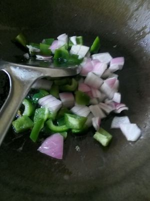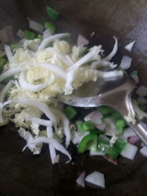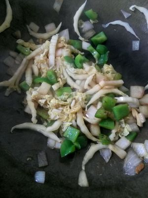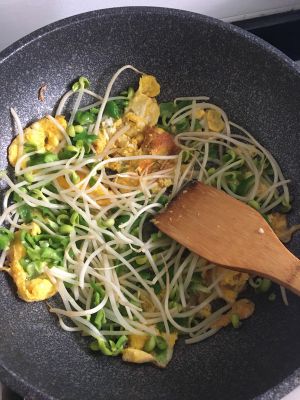 将豆芽菜和青椒放一块炒,豆芽菜不容易熟可以放一点点盐,好让它瘪下去