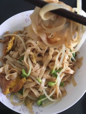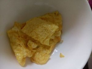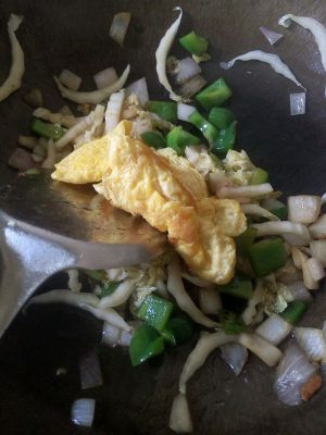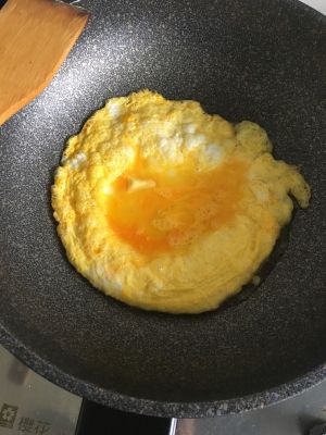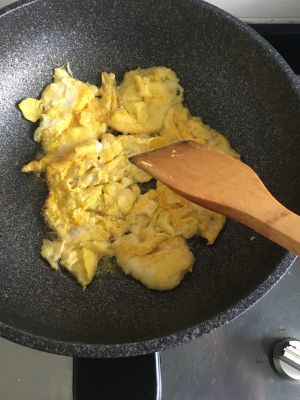 煎成性以后将鸡蛋块用锅铲弄散,以便面条里都有鸡蛋