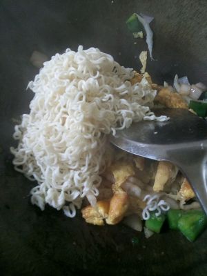 炒的七成熟将过冷水的面条捞起放入锅中一起炒,炒的过程中放入适量的盐,老抽调色,生抽体现,也可以放入鸡精,喜欢吃辣的人,更可以放老干妈在里面