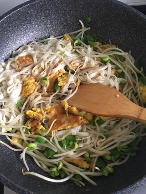 热油,比平时炒菜的油多些,因为要炒鸡蛋和配菜,面条也比较吃油。