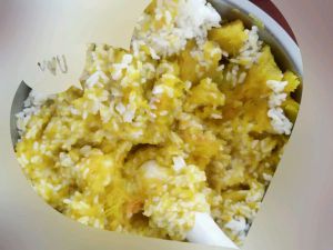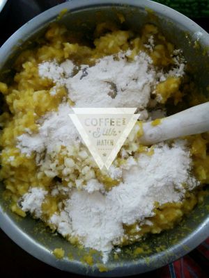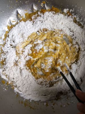 加入白糖、南瓜、糯米粉+普通面粉,拌均匀