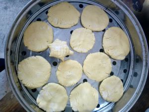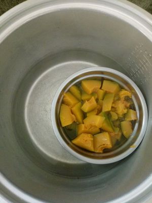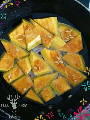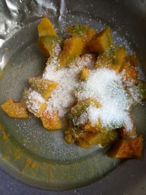 南瓜上撒糖,减少蒸的时间。上蒸锅蒸十分钟。