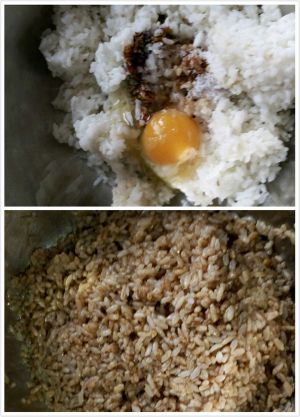 将隔夜的大米放在盆里,倒入一勺或两勺酱油、一勺生抽、少许糖、一点点油,再打入一颗鸡蛋,搅拌均匀。