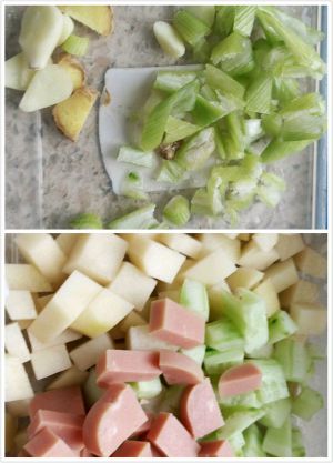 土豆削皮洗净切丁、火腿肠黄瓜切丁备用,葱姜蒜切好费用。