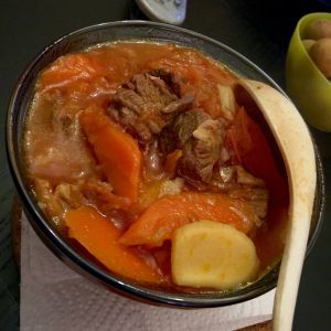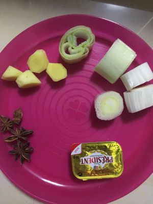 锅热后,加入一小块黄油,黄油化开之后加入洋葱炒香,再加入番茄翻炒,然后把所有材料加入锅中,加冷水,中小火慢炖3小时