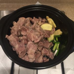 牛腩切块焯水,因为会炖的比较酥,所以不用切太小,会化!牛腩选择半精半肥交替的那种,这样的牛腩好,我选择的是澳洲牛腩!放入葱姜即可(这里补充一下,牛肉要用红酒焯水,用黄酒的话牛肉会老)