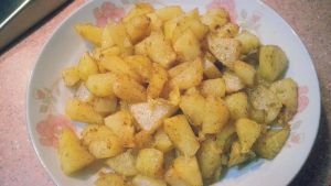 还可以顺带做点黑胡椒土豆块,当配餐。 做法:土豆去皮切小块,加黑胡椒粉和橄榄油和少许盐拌匀,炸锅180度7分钟拿出来翻动一下,再烤7分钟。