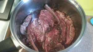 羊排放入容器内,加红酒、迷迭香、欧芹碎和少许海盐腌制2-3小时