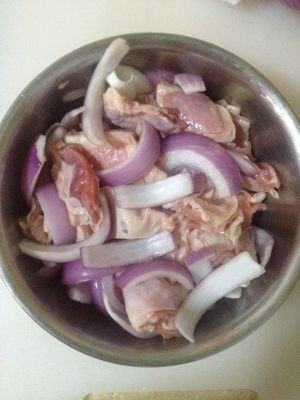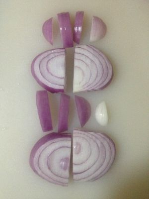 现在开始切洋葱,洋葱根据自己的羊排克数放半个到一个,我做的比较少,所以放了半个
