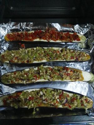 茄子蒸好后用筷子夹出放到准备好的烤盘没,一定要垫锡纸,否则吃完后很难洗的。把上面拌好的各种末用小勺平铺到茄子上。