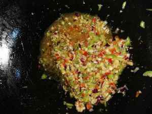 放油炒香蒜末肉丁,依次下入所有蔬菜丁。放入料酒、盐糖、生抽、蚝油出锅。