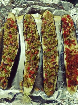 1.烤箱预热200度 2.茄子切开,像切芒果一样划刀口,3.锡纸刷上一层色拉油,蒜末调上色拉油后均匀刷到茄子上,手抓撒上盐粒,放入预热好的烤箱上下火25分钟 4.生抽老抽糖辣椒粉混合一起调成调料 5.烤15分钟后打开烤箱,戴好手套哦,均匀刷上调和汁,撒上孜然粒茴香粒(孜然粉茴香粉一样啦),继续烤10分钟。