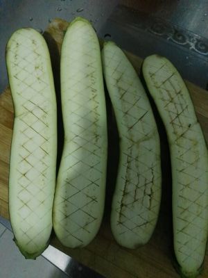 茄子洗净切两半,用小刀菱形划线,为了更入味。