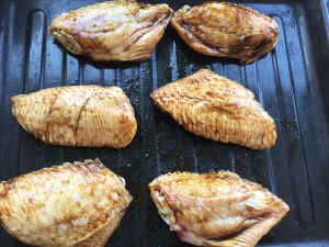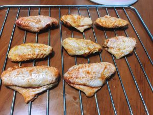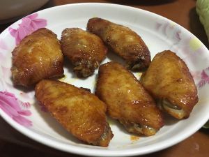 2 烤箱210 ℃预热 10分钟。将烤翅摆在托盘放进预热好的烤箱。 10分钟一次翻面,再烤10分钟。刷上蜂蜜再烤五分钟。