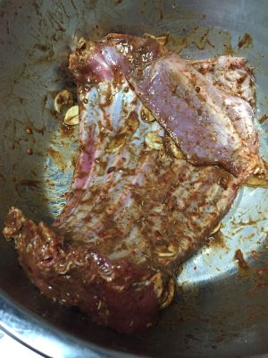 锅中放少许油,待油温上升后,将羊排脂肪多的一面向下,放入锅中煎制,用大火将过多的油脂通过热力分解,形成透彻的金黄色。