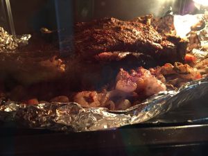 蔬菜时间到放羊排 ! 羊排平铺在蔬菜上面 把腌制剩余的所有料一起淋上去! 200度10分钟 图片是10分钟到了拿出来翻面的时候拍的! 翻一次面 继续烤10分钟即可 出锅前撒一层菜市场买的万能烧烤料就开吃吧!