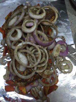 20分钟后打开锡纸,铺上洋葱圈,撒少许辣椒粉,敞开锡纸230度再烤制7分钟,出炉。