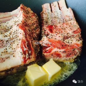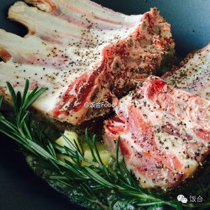 在锅里加入带皮拍散的大蒜、迷迭香、黄油,直至羊排表面呈棕黄色。