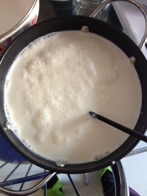 将牛奶溶液倒入鸡蛋溶液里~拌匀