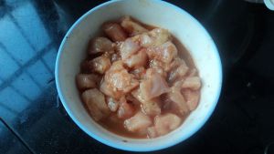 鸡胸肉切成丁,加入料酒、生姜丝、淀粉、调料粉搅拌均匀腌制5分钟左右