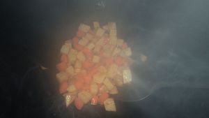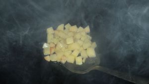 热锅倒入适量的油,把土豆丁倒入翻炒