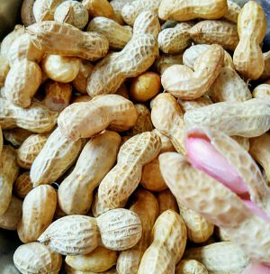 花生加入干淀粉和水反复搓洗,将花生壳表面洗净。用手在将花生捏开一个小口。