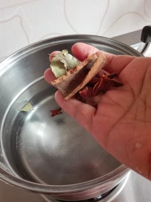 将葱姜蒜、八角(大料)、花椒、小茴香、香叶、和捏开的干红辣椒一起放入锅中。
