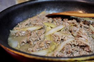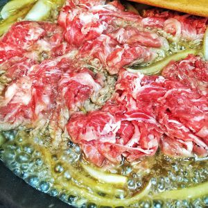 汤汁煮沸后,洋葱逐渐变软。然后加入肥牛,进行翻炒,让肥牛沾满汤汁~