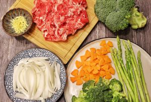 西兰花和胡萝卜煮熟后捞出(可以在水里加入适量盐和鸡精,这样西兰花胡萝卜口味更佳)。下150克左右牛肉卷,焯8成熟捞出。