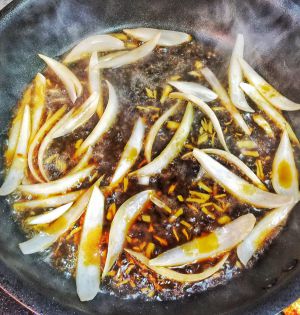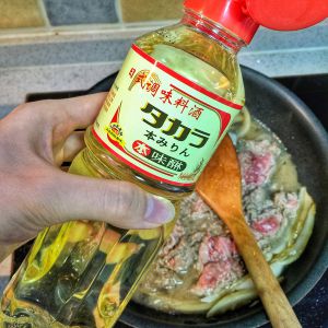 加入味啉和少许糖,还有盐,继续进行翻炒。这时候香味已经出来了~