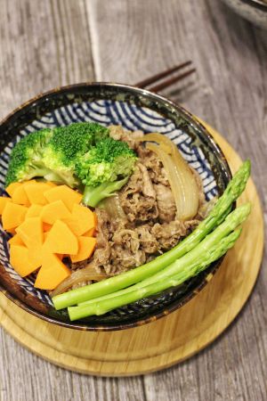然后将焯水之后的胡萝卜,西兰花,和芦笋放好,肥牛盖好,汤汁浇在饭上。 完成~ 开吃~