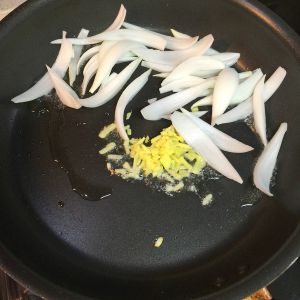 放油炒洋葱,随后放入肥牛翻炒,再倒入调好的酱汁,小火收汁。