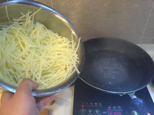 土豆丝下锅焯水,烫一下就行,为了让土豆丝的淀粉凝固,防止炒的时候粘锅糊底!