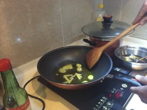 热锅凉油,放入葱花,姜丝煸炒出香味