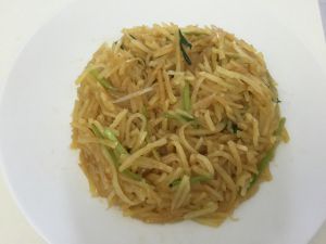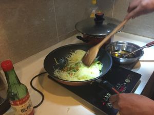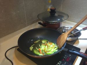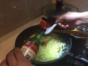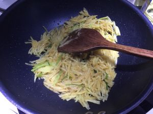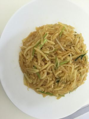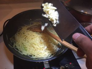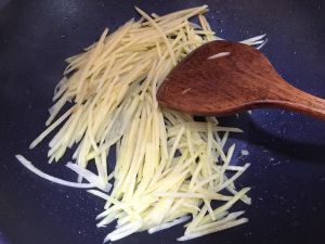放入土豆丝,加入盐、鸡精、料酒、炒一会放少量的水!