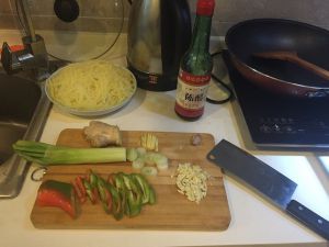 土豆丝炒好后,过凉水,沥干装盘备用。切姜丝,葱花,尖椒,蒜末如图,备用
